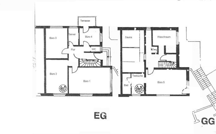 Sehr schöne geräumige Büroräume (4 Büros auf einer Etage, sowie weiterer Büroraum (mit zusätzlichem separatem Eingang), zzgl. Abstell-/Serverraum, kleine Teeküche, Tageslicht-WC und kleines Bad (im GG) zu vermieten.