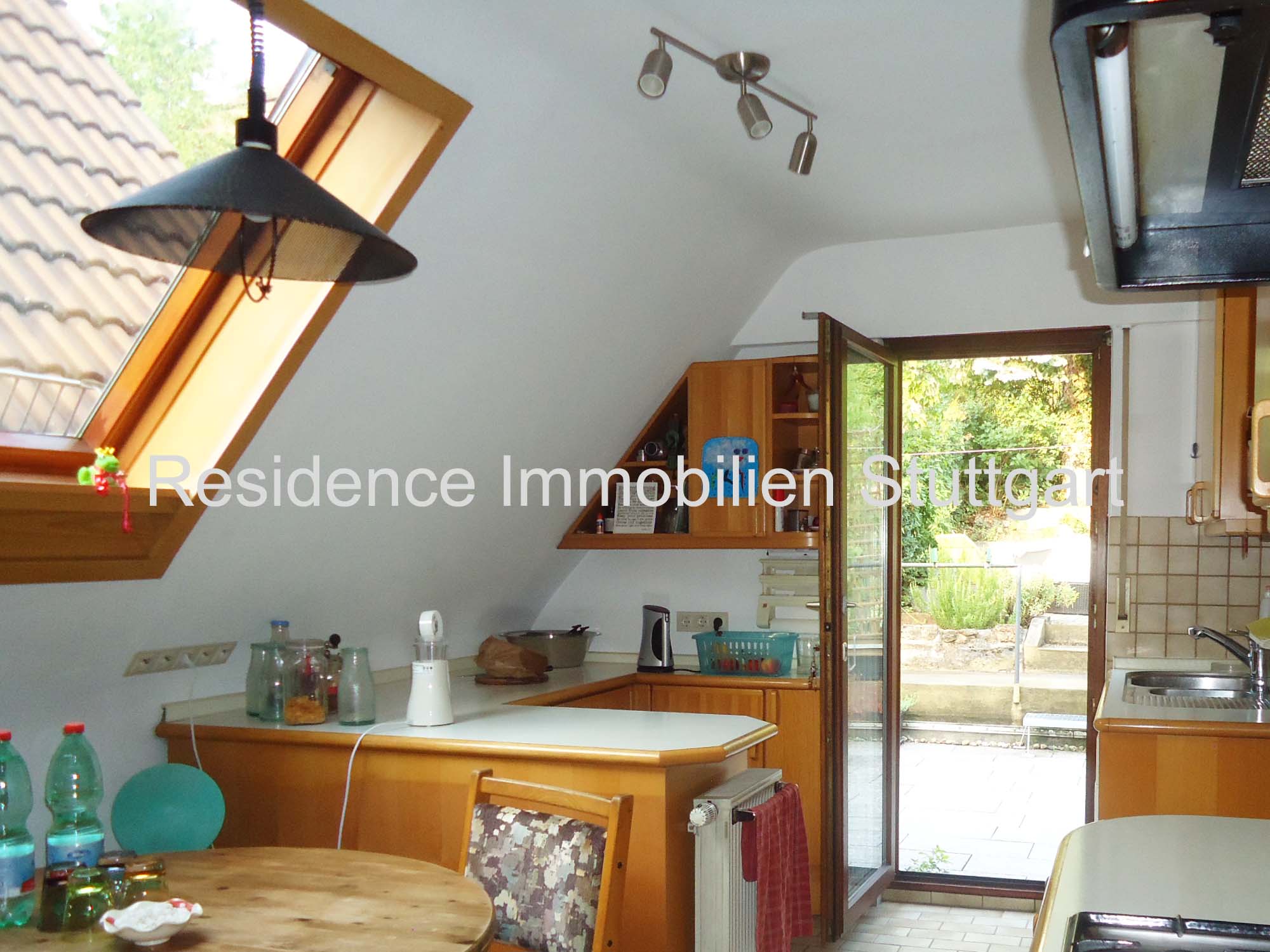- helle Wohnküche, mit Platz für Esstisch, inklusive Einbauküche und Zugang zu Terrasse und Garten