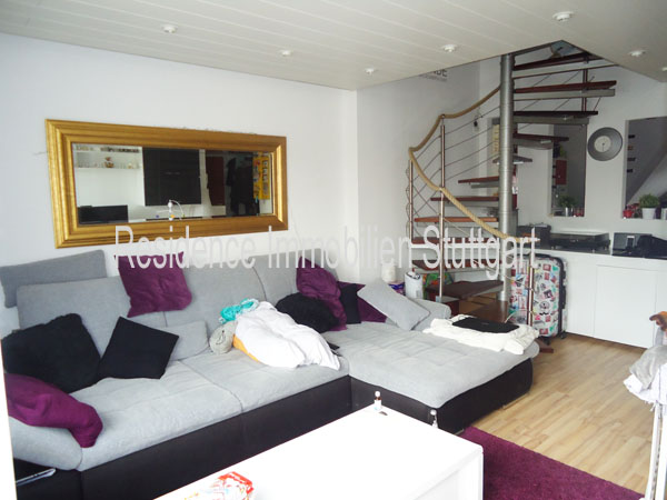 Stuttgart-Möhringen | Wohnungen | ca. 62 m² | 2,5 ZimmerDie geräumige DG-Maisonettewohnung (3. OG) verfügt über eine schöne Dachloggia mit Ausblick in die Nachbargärten, sowie einen TG-Stellplatz. Im 1. DG befindet sich der große Wohnbereich mit Zugang zur Loggia, der Essplatz und die offene Küche, sowie das Gäste-WC.